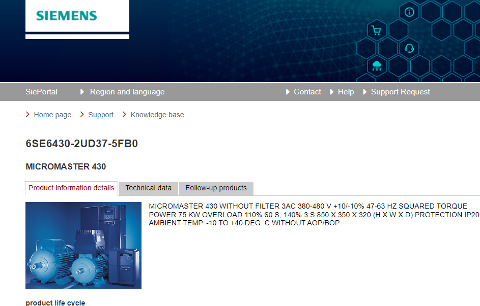 MICROMASTER 430 WITHOUT FILTER 3AC 380-480 V +10/-10% 47-63 HZ SQUARED TORQUE POWER 75 KW OVERLOAD 110% 60 S, 140% 3 S 850 X 350 X 320 (H X W X D) PROTECTION IP20 AMBIENT TEMP. -10 TO +40 DEG. C WITHOUT AOP/BOP