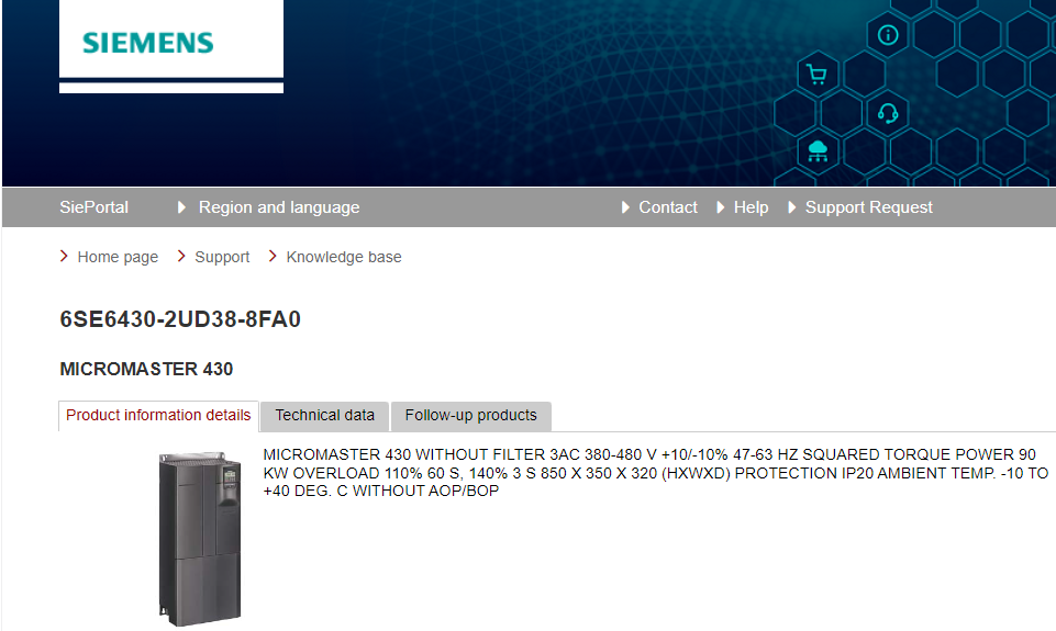 MICROMASTER 430 WITHOUT FILTER 3AC 380-480 V +10/-10% 47-63 HZ SQUARED TORQUE POWER 90 KW OVERLOAD 110% 60 S, 140% 3 S 850 X 350 X 320 (H X W X D) PROTECTION IP20 AMBIENT TEMP. -10 TO +40 DEG. C WITHOUT AOP/BOP