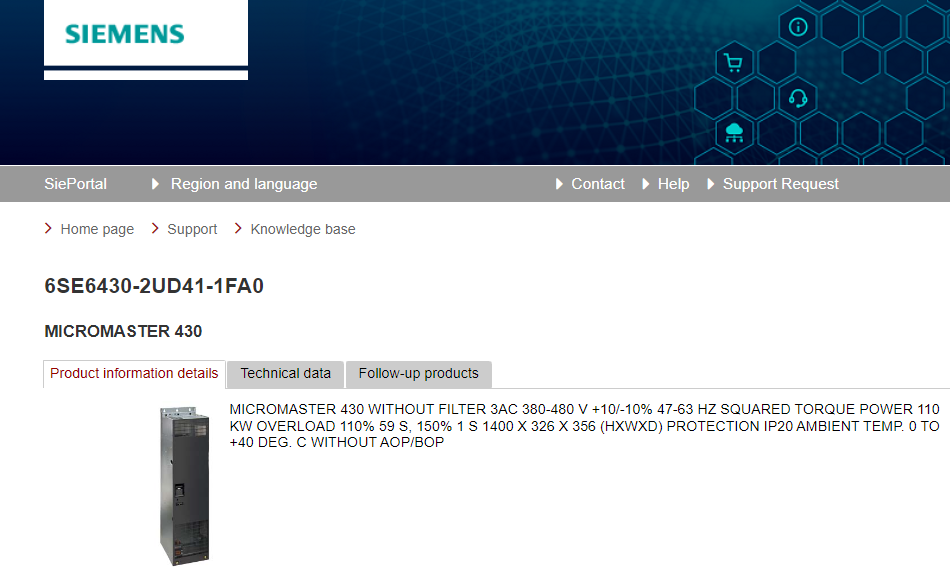 MICROMASTER 430 WITHOUT FILTER 3AC 380-480 V +10/-10% 47-63 HZ SQUARED TORQUE POWER 110 KW OVERLOAD 110% 59 S, 150% 1 S 1400 X 326 X 356 (HXWXD) PROTECTION IP20 AMBIENT TEMP. 0 TO +40 DEG. C WITHOUT AOP/BOP