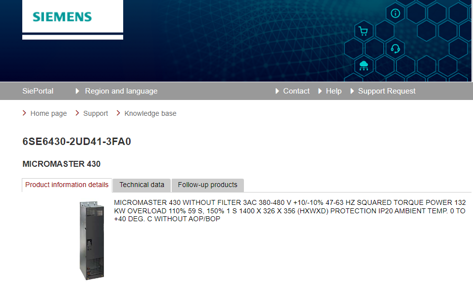 MICROMASTER 430 WITHOUT FILTER 3AC 380-480 V +10/-10% 47-63 HZ SQUARED TORQUE POWER 132 KW OVERLOAD 110% 59 S, 150% 1 S 1400 X 326 X 356 (HXWXD) PROTECTION IP20 AMBIENT TEMP. 0 TO +40 DEG. C WITHOUT AOP/BOP