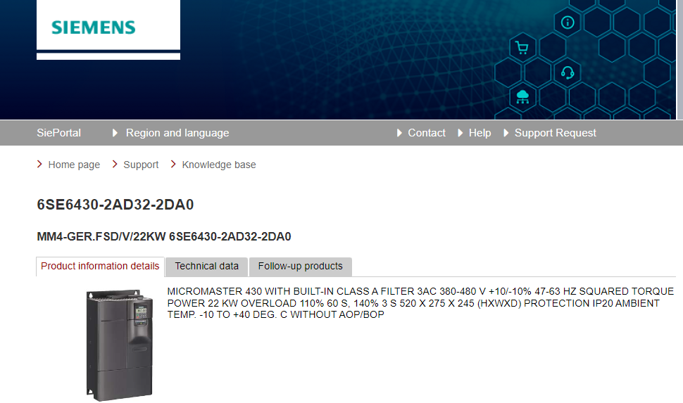 MICROMASTER 430 WITH BUILT-IN CLASS A FILTER 3AC 380-480 V +10/-10% 47-63 HZ SQUARED TORQUE POWER 22 KW OVERLOAD 110% 60 S, 140% 3 S 520 X 275 X 245 (H X W X D) PROTECTION IP20 AMBIENT TEMP. -10 TO +40 DEG. C WITHOUT AOP/BOP