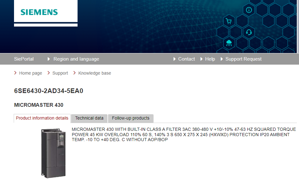 MICROMASTER 430 WITH BUILT-IN CLASS A FILTER 3AC 380-480 V +10/-10% 47-63 HZ SQUARED TORQUE POWER 45 KW OVERLOAD 110% 60 S, 140% 3 S 650 X 275 X 245 (H X W X D) PROTECTION IP20 AMBIENT TEMP. -10 TO +40 DEG. C WITHOUT AOP/BOP