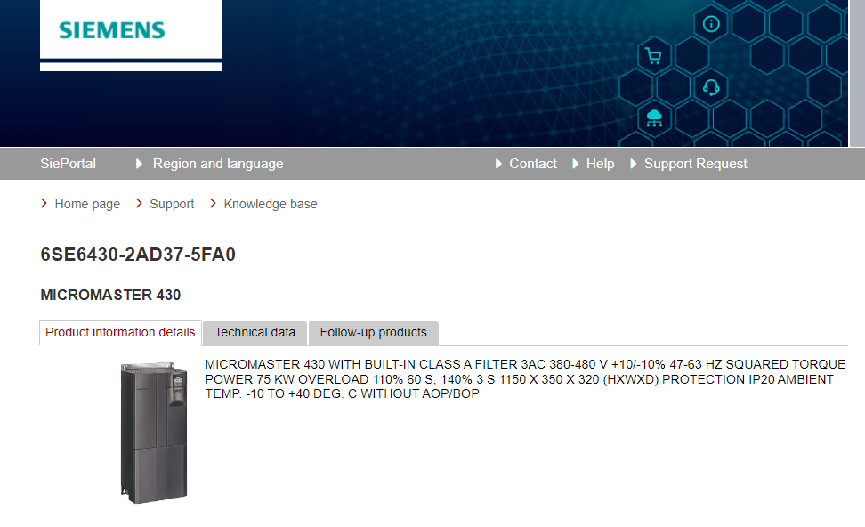MICROMASTER 430 WITH BUILT-IN CLASS A FILTER 3AC 380-480 V +10/-10% 47-63 HZ SQUARED TORQUE POWER 75 KW OVERLOAD 110% 60 S, 140% 3 S 1150 X 350 X 320 (HXWXD) PROTECTION IP20 AMBIENT TEMP. -10 TO +40 DEG. C WITHOUT AOP/BOP