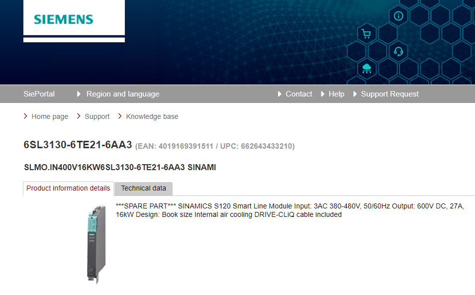 ***SPARE PART*** SINAMICS S120 Smart Line Module Input: 3AC 380-480V, 50/60Hz Output: 600V DC, 27A, 16kW Design: Book size Internal air cooling DRIVE-CLiQ cable included