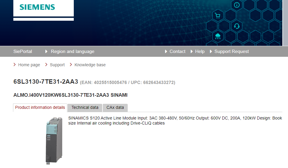 SINAMICS S120 Active Line Module Input: 3AC 380-480V, 50/60Hz Output: 600V DC, 200A, 120kW Design: Book size Internal air cooling including Drive-CLiQ cables