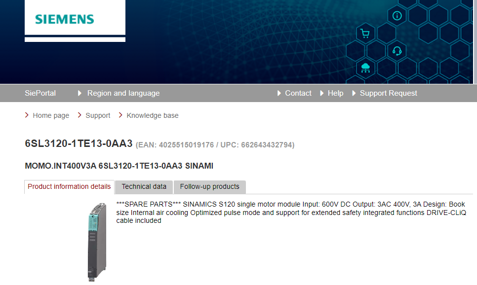 ***SPARE PARTS*** SINAMICS S120 single motor module Input: 600V DC Output: 3AC 400V, 3A Design: Book size Internal air cooling Optimized pulse mode and support for extended safety integrated functions DRIVE-CLiQ cable included