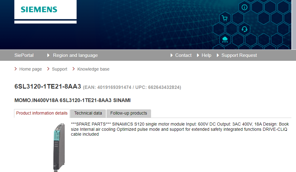 ***SPARE PARTS*** SINAMICS S120 single motor module Input: 600V DC Output: 3AC 400V, 18A Design: Book size Internal air cooling Optimized pulse mode and support for extended safety integrated functions DRIVE-CLiQ cable included