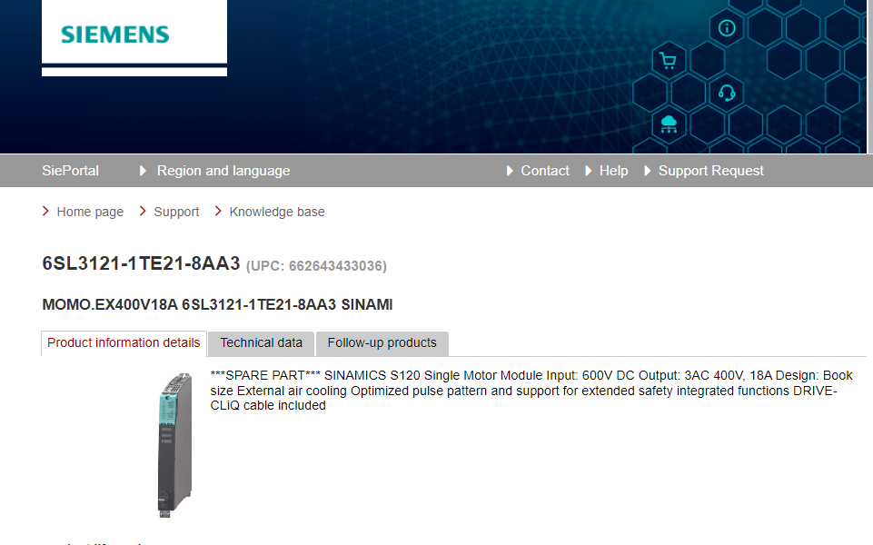 ***SPARE PART*** SINAMICS S120 Single Motor Module Input: 600V DC Output: 3AC 400V, 18A Design: Book size External air cooling Optimized pulse pattern and support for extended safety integrated functions DRIVE-CLiQ cable included