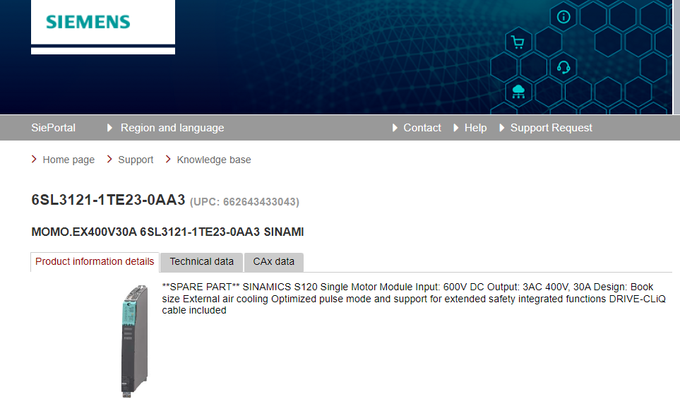 **SPARE PART** SINAMICS S120 Single Motor Module Input: 600V DC Output: 3AC 400V, 30A Design: Book size External air cooling Optimized pulse mode and support for extended safety integrated functions DRIVE-CLiQ cable included