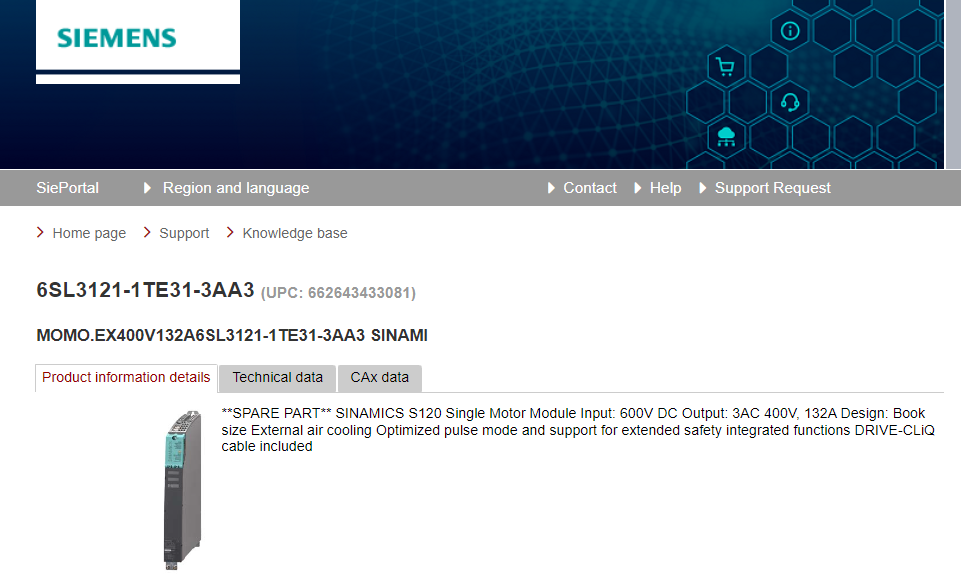 **SPARE PART** SINAMICS S120 Single Motor Module Input: 600V DC Output: 3AC 400V, 132A Design: Book size External air cooling Optimized pulse mode and support for extended safety integrated functions DRIVE-CLiQ cable included
