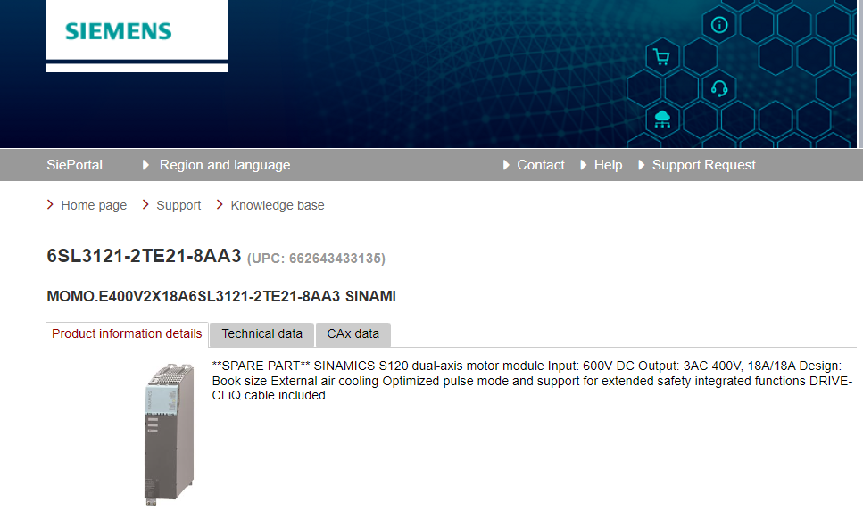 **SPARE PART** SINAMICS S120 dual-axis motor module Input: 600V DC Output: 3AC 400V, 18A/18A Design: Book size External air cooling Optimized pulse mode and support for extended safety integrated functions DRIVE-CLiQ cable included