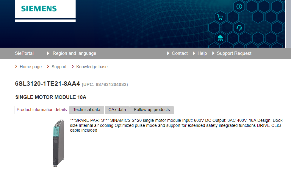SINAMICS S120 single motor module 6SL3120-1TE21-8AA4