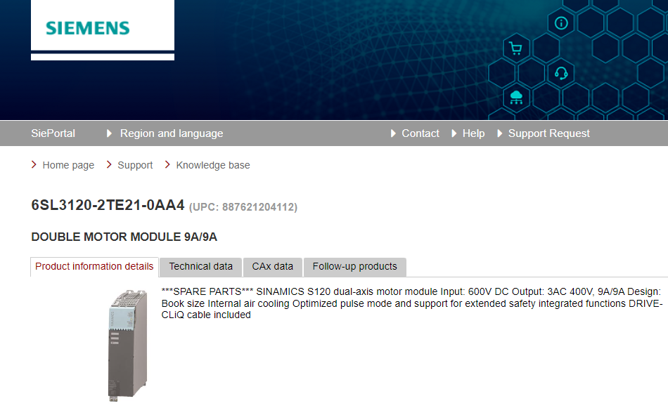 ***SPARE PARTS*** SINAMICS S120 dual-axis motor module Input: 600V DC Output: 3AC 400V, 9A/9A Design: Book size Internal air cooling Optimized pulse mode and support for extended safety integrated functions DRIVE-CLiQ cable included
