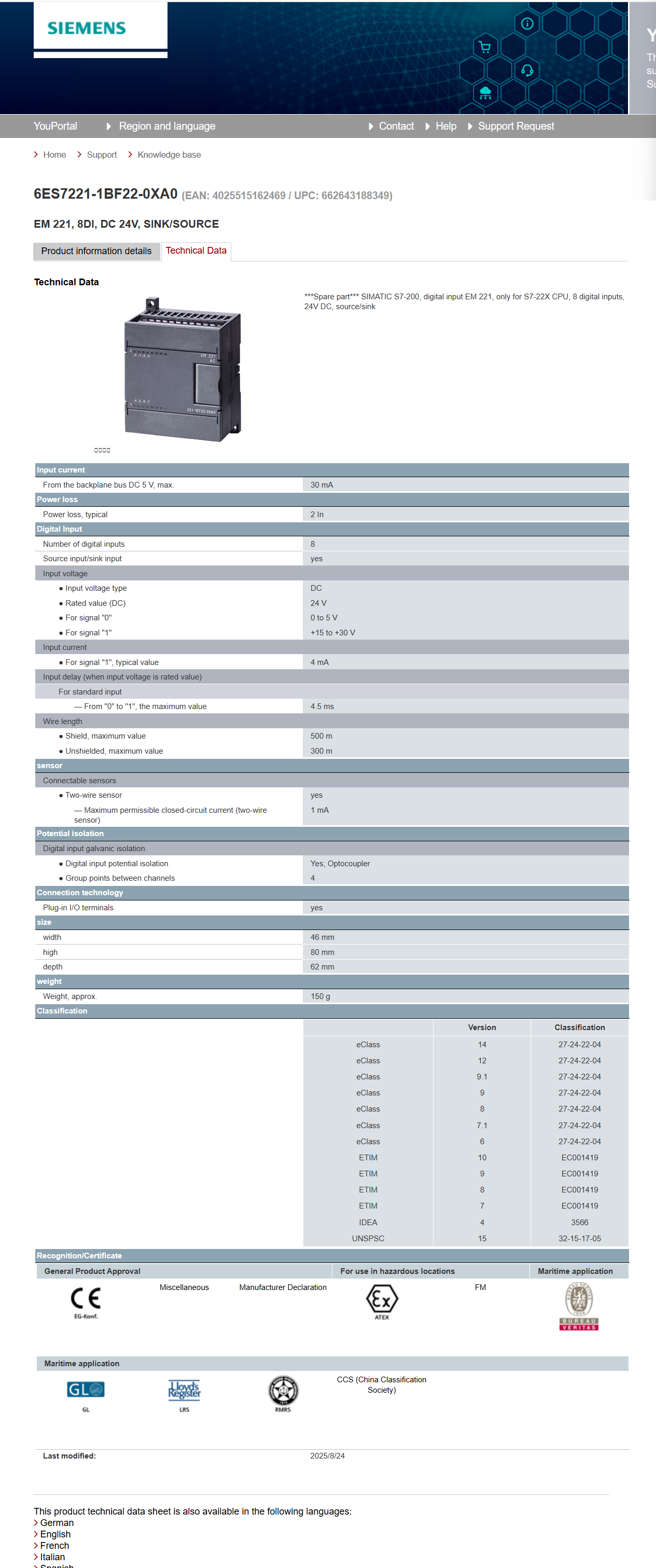 ***Spare part*** SIMATIC S7-200, digital input EM 221, only for S7-22X CPU, 8 digital inputs, 24V DC, source/sink