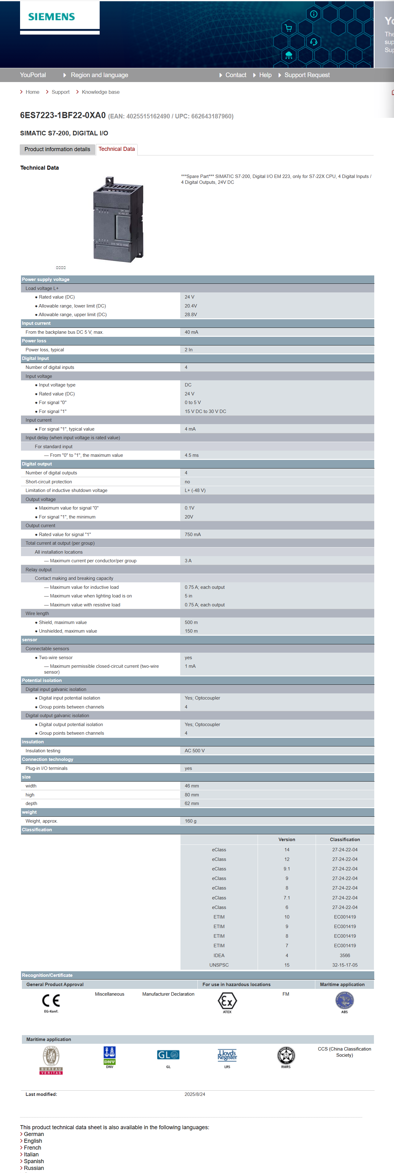 Siemens digital input/output module 6ES7223-1BF22-0XA0