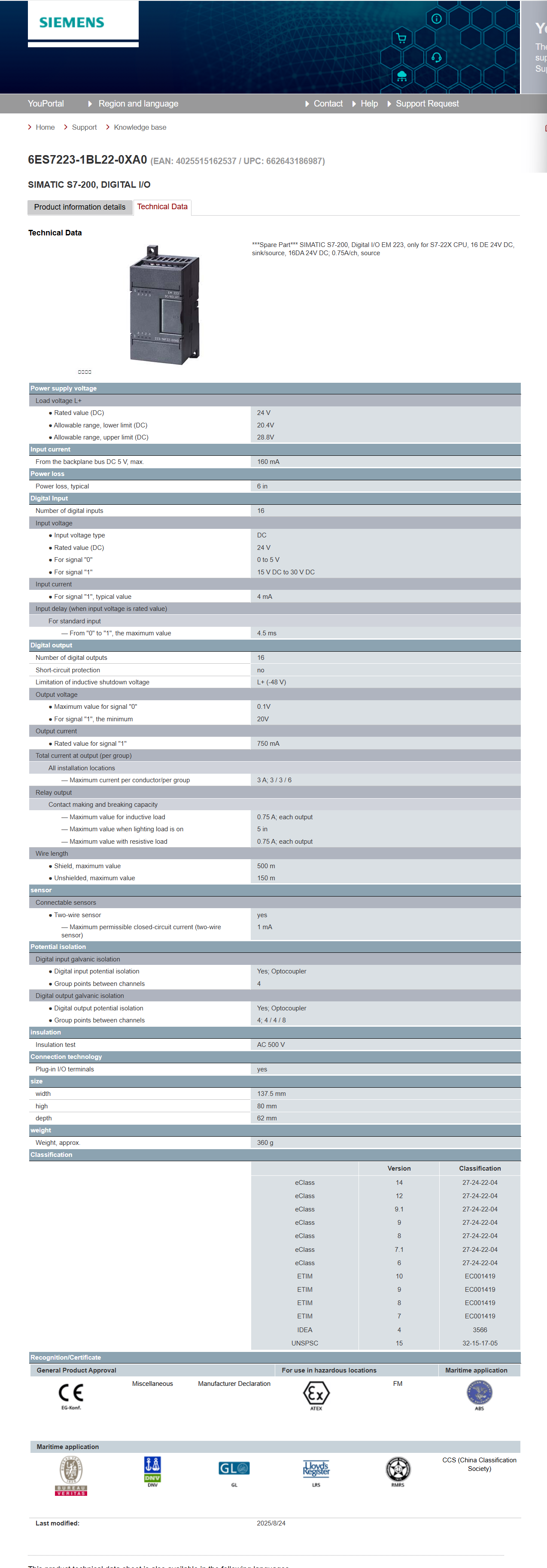 Siemens digital input/output module 6ES7223-1BL22-0XA0