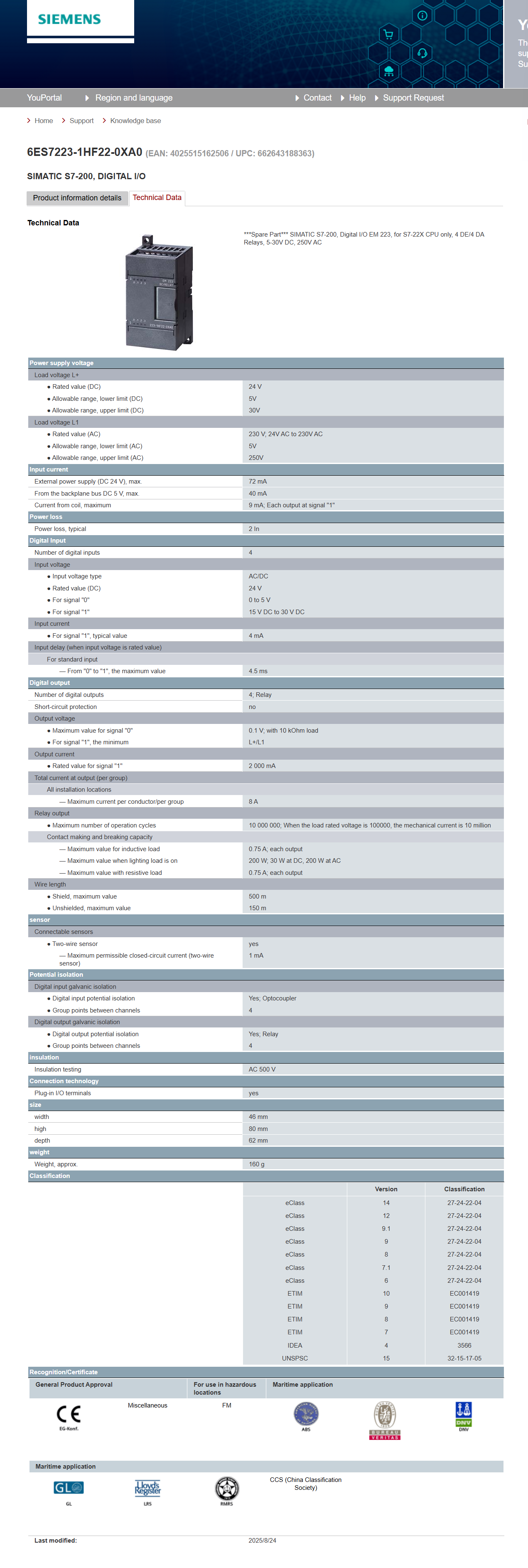 Siemens digital input/output module 6ES7223-1HF22-0XA0