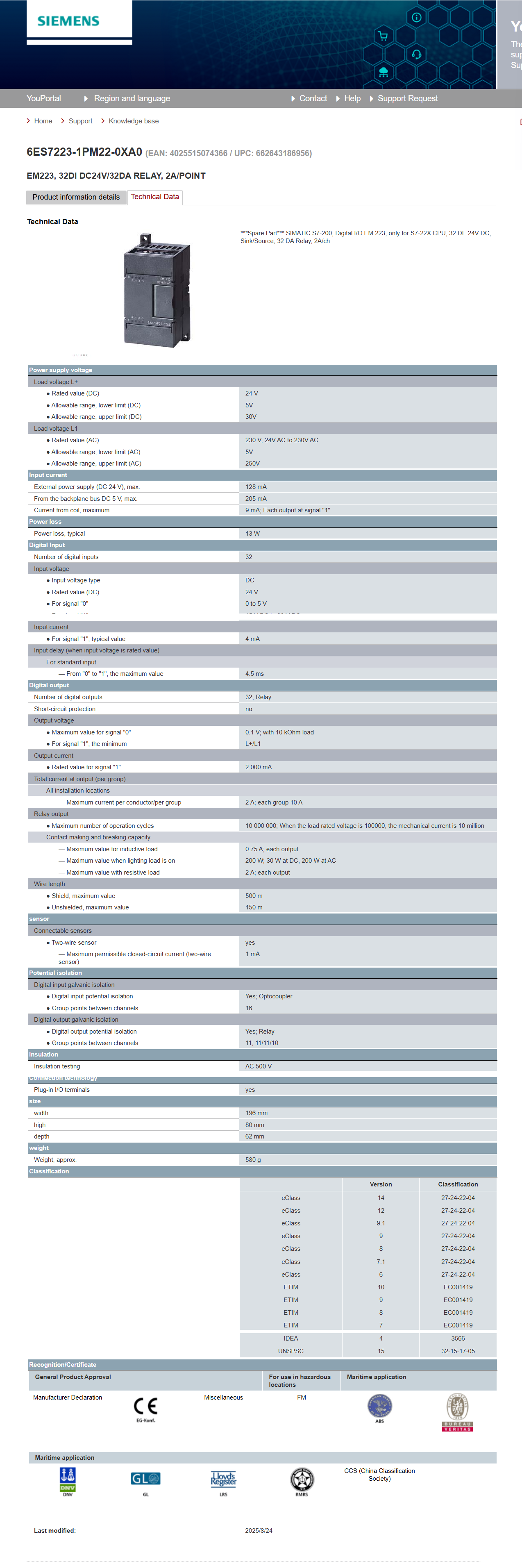 Siemens digital input/output module 6ES7223-1PM22-0XA0