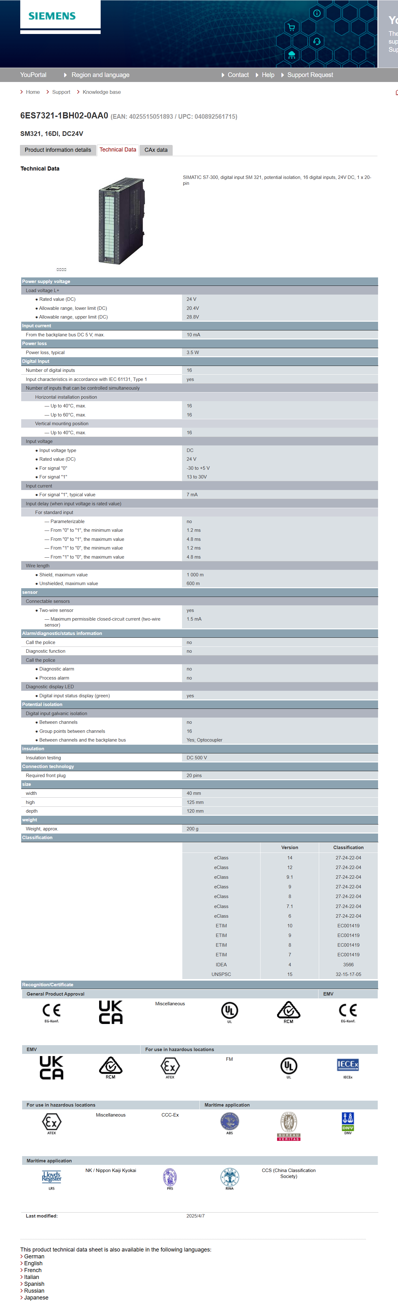 SIMATIC S7-300, Digital Input SM 321 6ES7321-1BH02-4AA2
