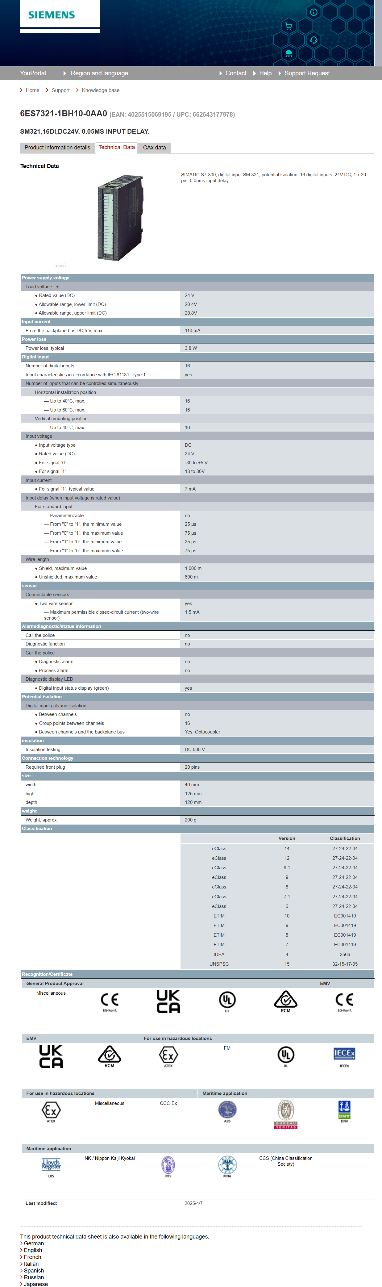 SIMATIC S7-300, Digital Input SM 321 6ES7321-1BH10-0AA0