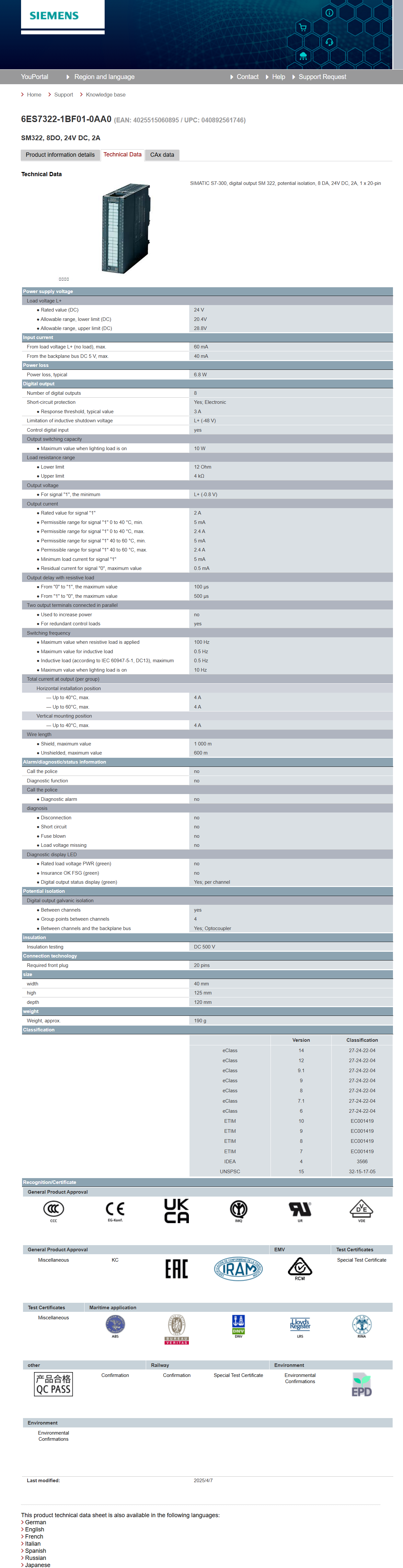 SIMATIC S7-300, digital output SM 322, potential isolation, 8 DA, 24V DC, 2A, 1 x 20-pin