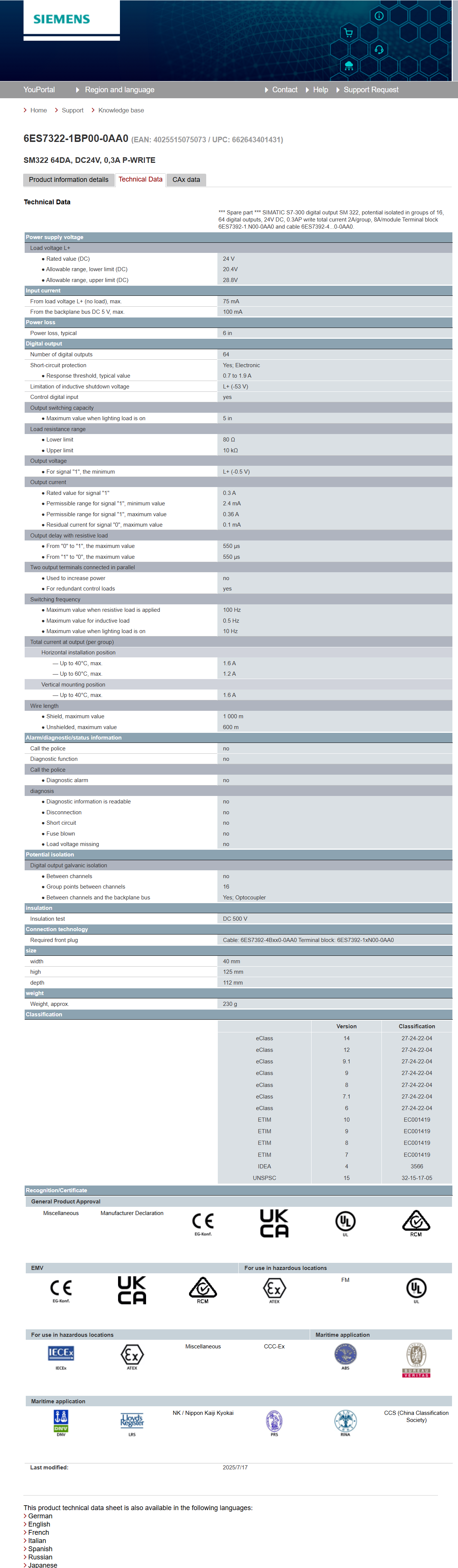 | *** Spare part *** SIMATIC S7-300 digital output SM 322, potential isolated in groups of 16, 64 digital outputs, 24V DC, 0.3AP write total current 2A/group, 8A/module Terminal block 6ES7392-1.N00-0AA0 and cable 6ES7392-4…0-0AA0. |