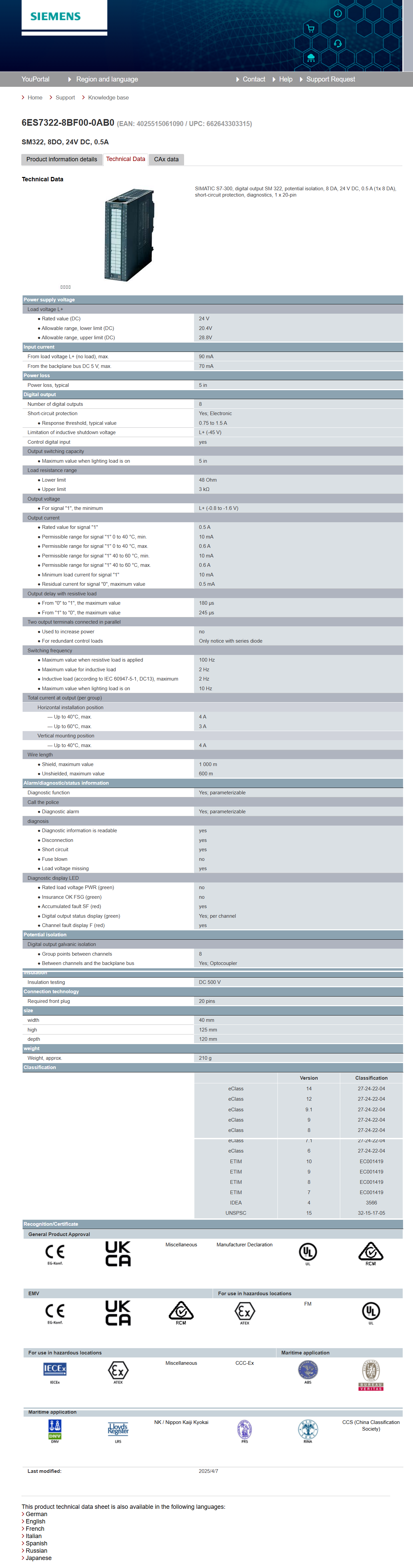 SIMATIC S7-300, Digital output SM 322 6ES7322-8BF00-0AB0