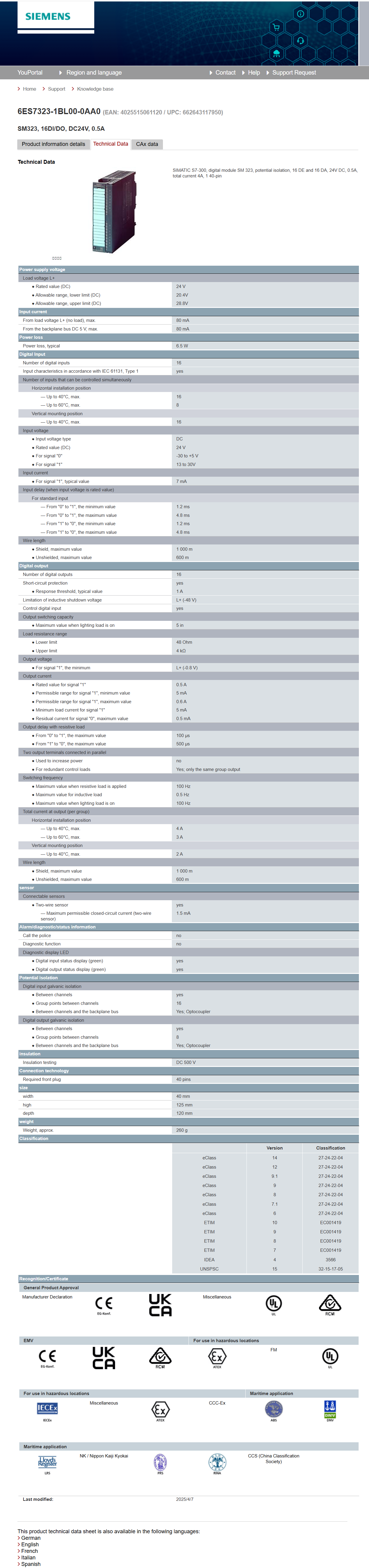 | SIMATIC S7-300, digital module SM 323, potential isolation, 16 DE and 16 DA, 24V DC, 0.5A, total current 4A, 1 40-pin |