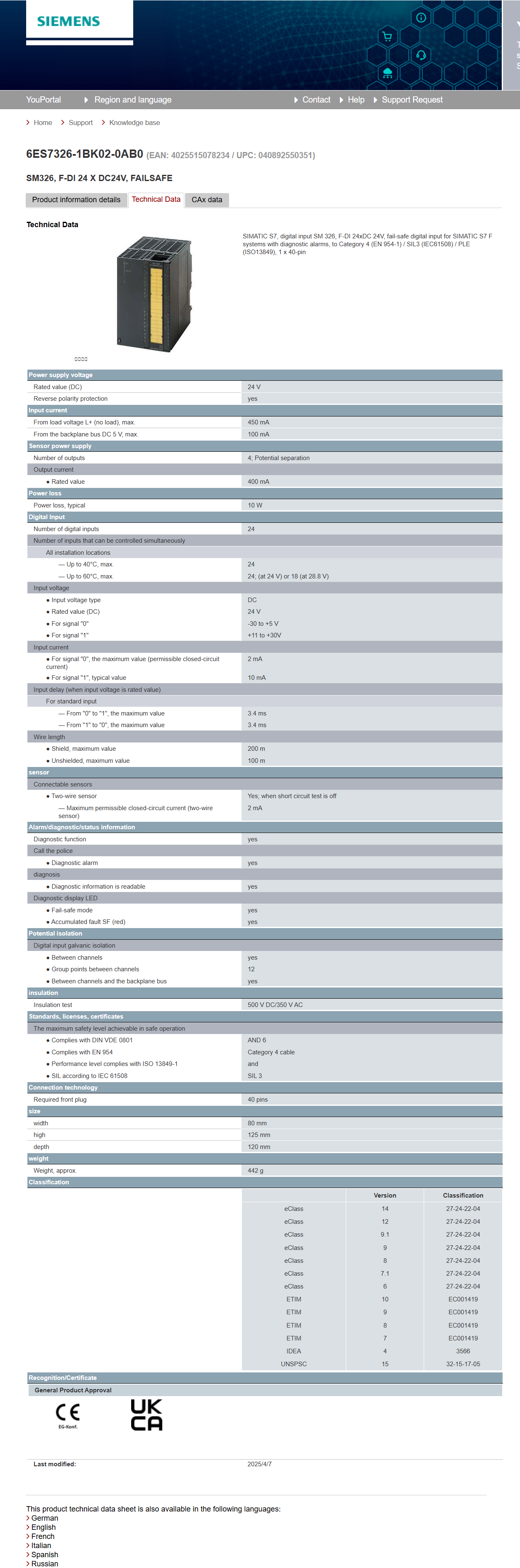 | SIMATIC S7, digital input SM 326, F-DI 24xDC 24V, fail-safe digital input for SIMATIC S7 F systems with diagnostic alarms, to Category 4 (EN 954-1) / SIL3 (IEC61508) / PLE (ISO13849), 1 x 40-pin |