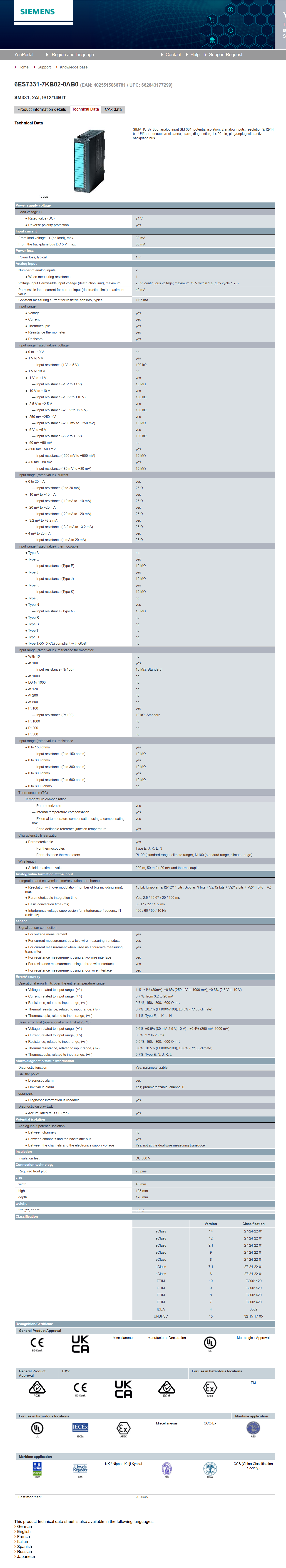 SIMATIC S7-300, logic input SM 331 6ES7331-7KB02-0AB0