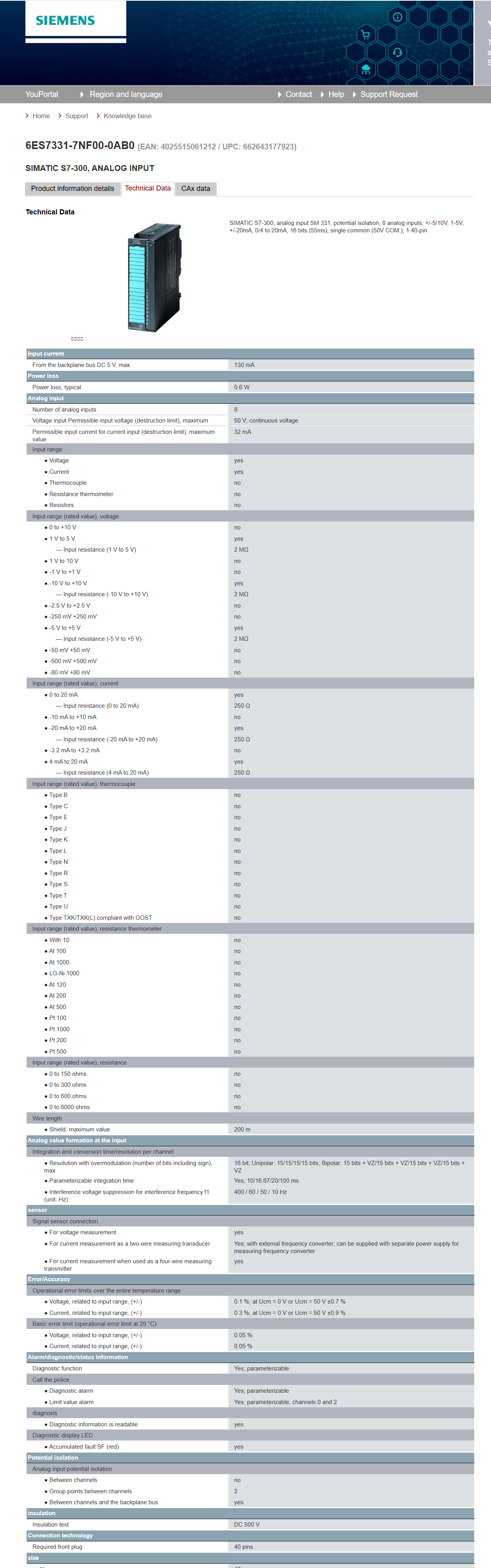 SIMATIC S7-300, Logic Input SM 331 6ES7331-7NF00-4AB2