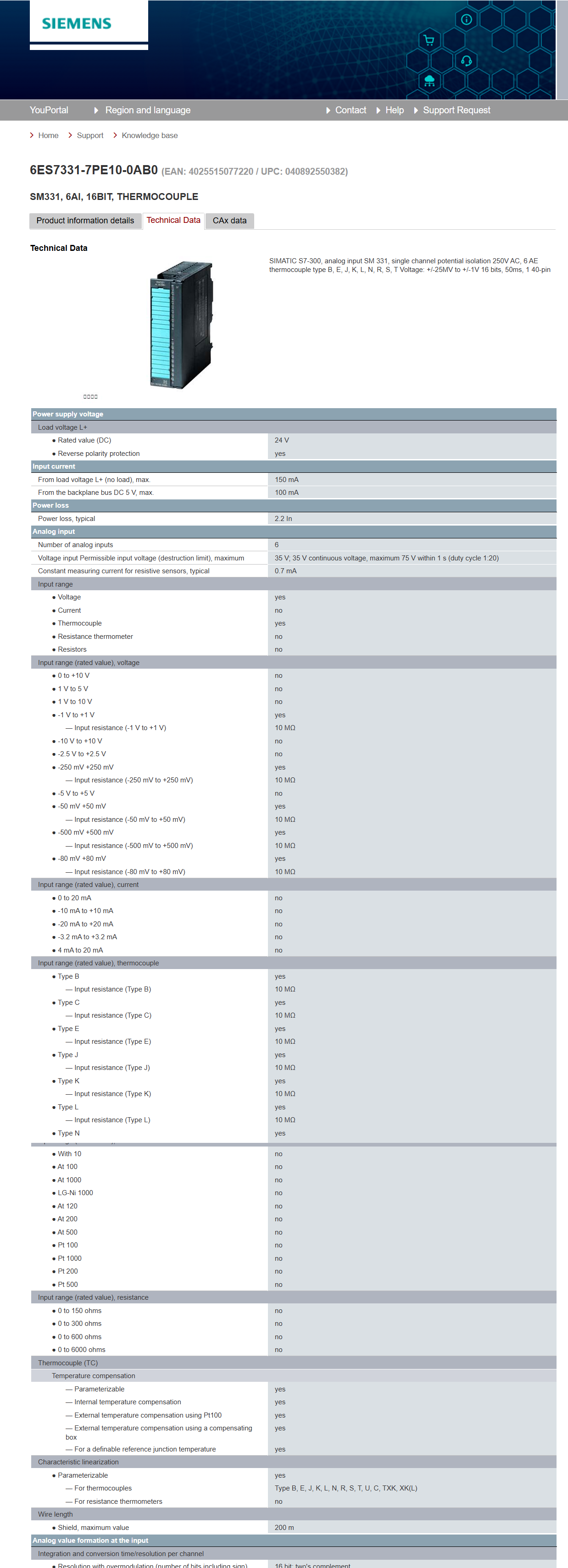 SIMATIC S7-300, analog input SM 331, single channel potential isolation 250V AC, 6 AE thermocouple type B, E, J, K, L, N, R, S, T Voltage: +/-25MV to +/-1V 16 bits, 50ms, 1 40-pin