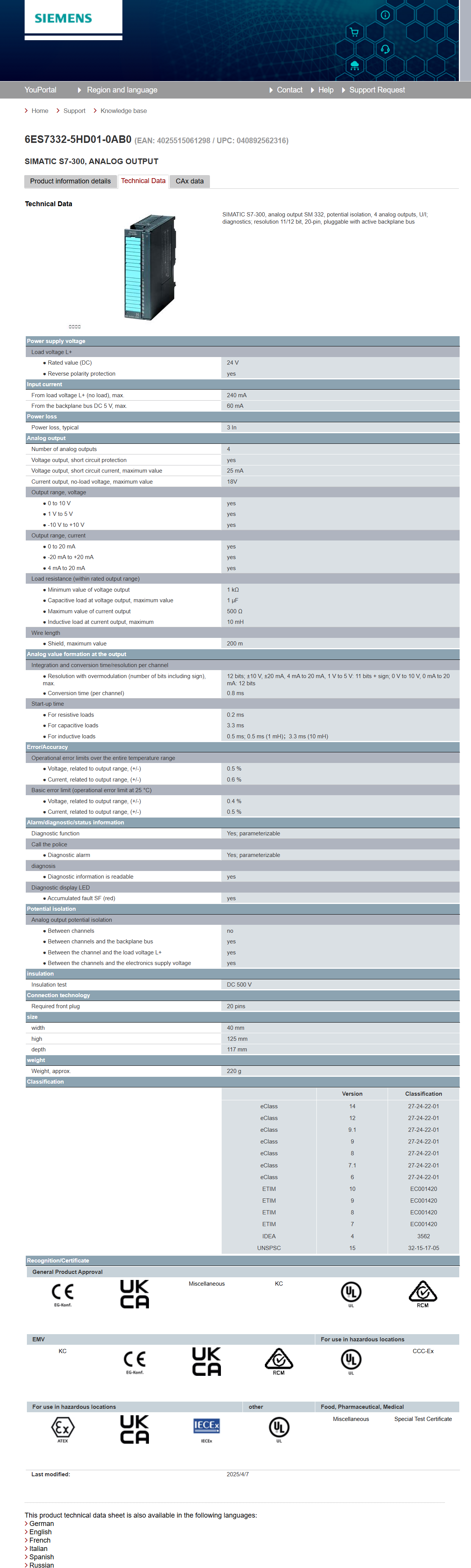 Siemens analog output module 6ES7332-5HD01-0AB0