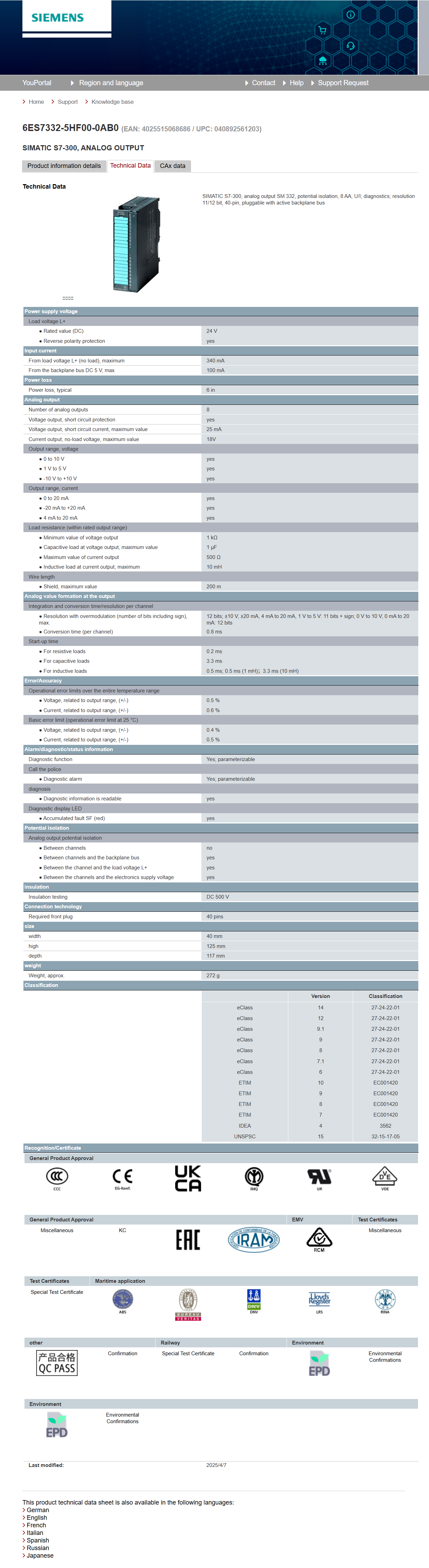 Siemens analog output module 6ES7332-5HF00-4AB1