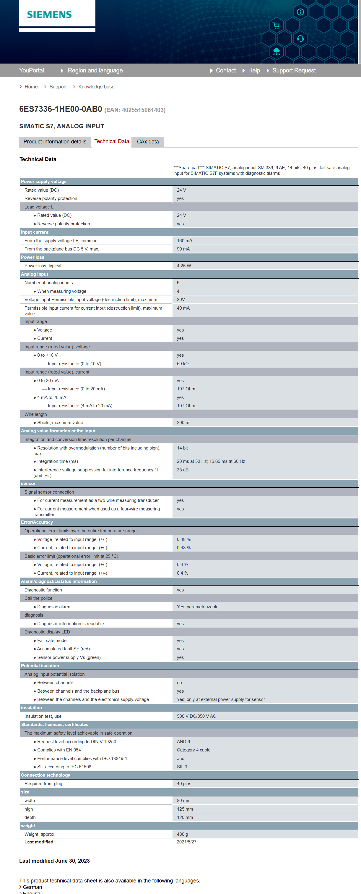 ***Spare part*** SIMATIC S7, analog input SM 336, 6 AE; 14 bits; 40 pins, fail-safe analog input for SIMATIC S7F systems with diagnostic alarms