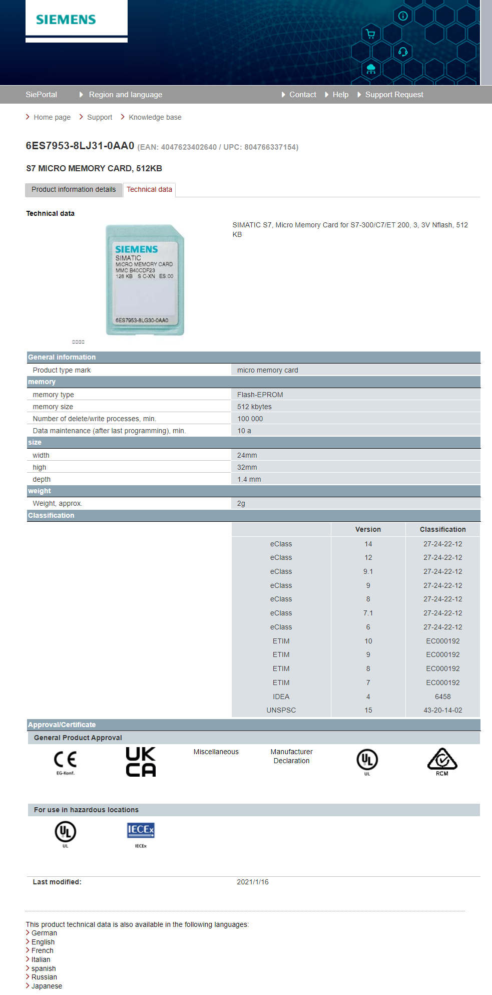 SIMATIC S7, MMC card 512K 6ES7953-8LJ31-0AA0