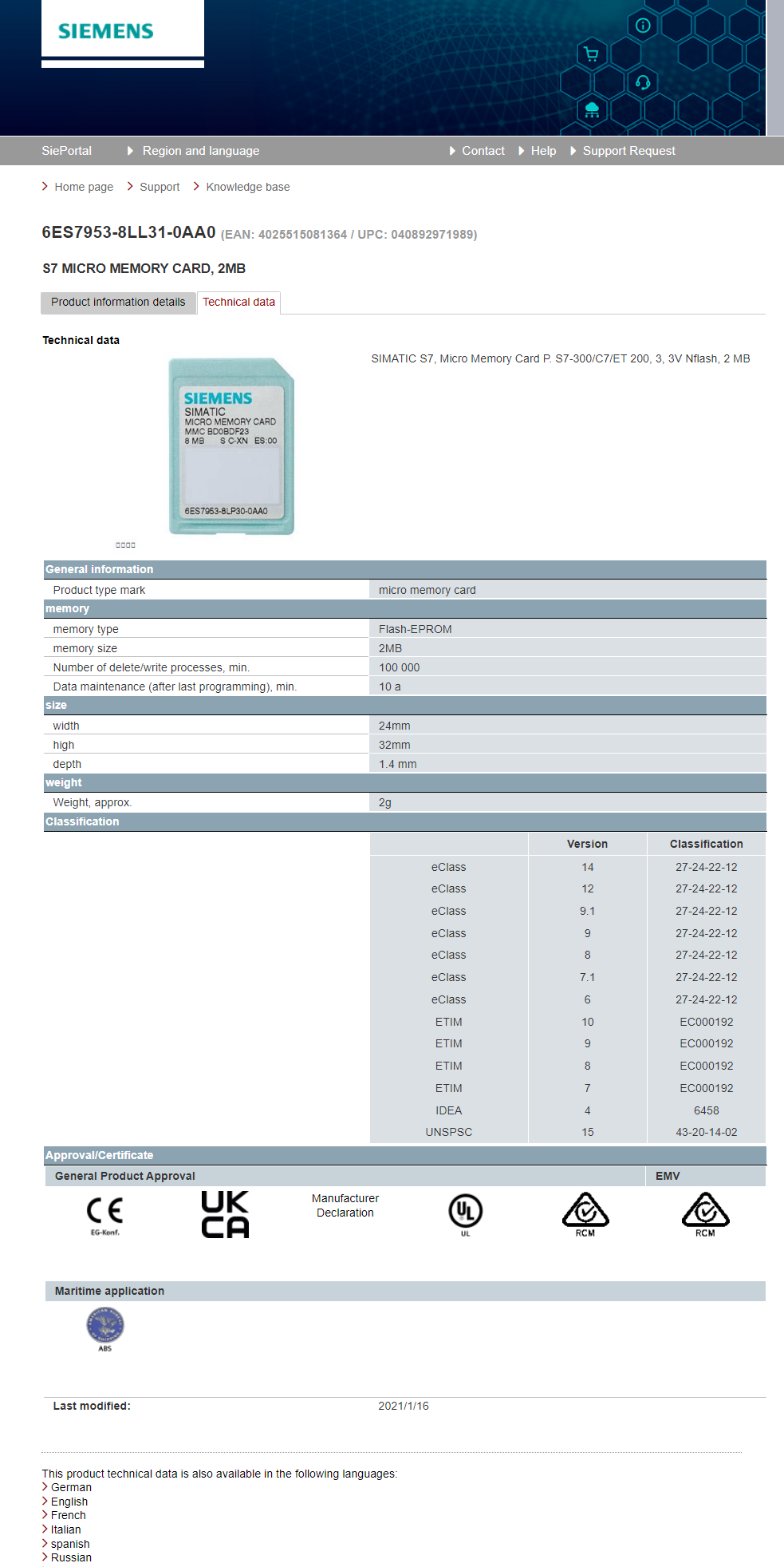 SIMATIC S7, Micro Memory Card P. S7-300/C7/ET 200, 3, 3V Nflash, 2 M